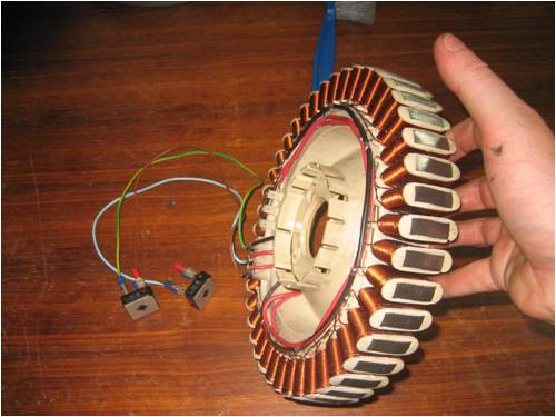 Looks like the stock rewire for 7x2C in Star to me Well Done! Chopped every six coils apart and wired accordingly. OK to share a rec across two phases. I trust you have bolted the magnet hub on the shaft and bearings and given her a spin now the rewire is done? If she still spins (generally you have got it right) Now that she's reconnected no more lethal voltages being generated, thats good to. re making the shaft run more freely in the hub. Knock out the bearings, using a small screwdriver, pick the seal out of ONE SIDE only. put one back in with a little loctite on the bearing in the bearing mount with the exposed side in the middle, put the spacer back in put the other bearing back in also with the missing seal on the inside (also loctite to housing), add a good squirt sewing machine oil / any oil, carefully re-insert the shaft and loctite it in there too. This should keep the oil in at least for a while and reduce seal drag by 50% Karl Luck favours the well prepared |