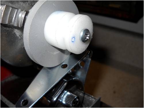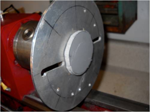 To cut the cam, which makes it all work, I used a face plate and two- sided tape. I stuck a rough-cut circle of 1/4" HDPE (plastic) sheet to the tape and spun it up. Double-sided tape holds work remarkably well, even metals. Here is the final-cut of the cam piece. I marked the center with a pencil, so later I can accurately measure out 1/8" to drill the mounting hole. The cam must travel 1/4" to properly operate the little push-button on the counter. If you don't have experience on a lathe, when things are cut or in this case when things spin off center, the total amount of movement is twice the distance from center, because it comes from each side. Here is the finished product, securely clamped onto the lathe in the proper position ready to count until the cows come home! . . . . . Mac Nothing difficult is ever easy! Perhaps better stated in the words of Morgan Freeman, "Where there is no struggle, there is no progress!" Copeville, Texas |