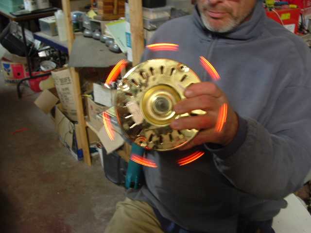 A poly outer ring is shown in place. I now poured the resin cast into the level mold. When the resin hardens the stator can be pulled from the magnet ring. The poly is also removed and silicone is used for securing the ringto the case. In this last picture my brother Bill is spinning a test model by hand. Using two magnets and two orange leds, he demonstrates the output.