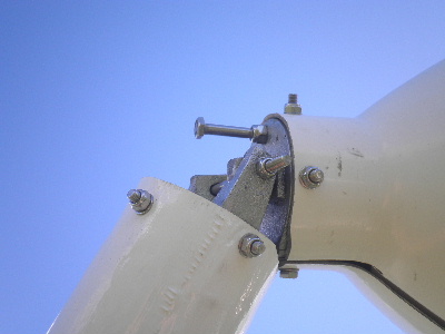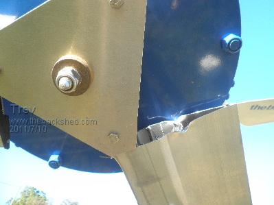 No steel tube, I see no benefit of steel tube. The alloy extrusion is like an 'I Beam' by itself. Adding weight in steel tube only makes it heavier and centrifical forces then are greater. A 19mm solid bar inside the 25mm x 3 wall thickness tube is much weaker than 25mm solid. The weak point is at the hub. This is where the 25mm solid bar bent. I don't believe that the 300mm length of bar is a problem. My problem was that I should have put in at least 2 bolts through the extrusion/solid bar to stop the extrusion outer skins seperating and allowing it to pivot on one bolt. I assumed the extrusion internal shape would hold it. I had to hit the bar in with a hammer. It was tight. Yes Glenn, I have seen that method of balancing. I just assumed the extrusion to be of similar weight. I do agree that the blade set does need to be balanced properly. The angle is no problem, they are set exactly the same. Phil, with big heavy blades, I would want my mill furling at 10 m/s, thats 36km/hr. That happens about once a year here. Karl, 15kg is heavy. I never weighed this extrusion set, but the weight does concern me some. My fibreglass 2.9 blades are only 1.5kg each. Karl, with the hole for the bolt in the hub, I drilled a 1/2 inch hole in the steel bar that allows for twisting. All good advice, thanks guys, I have made note. For now I have the shortened extrusion fitted with 3 bolts through the extrusion/steel bar and only one bolt through the hub/steel bar. The bar is the same pieces, straightened as much as possible. They are 25mm diameter and 300mm long, about 60mm in the hub and the rest in the extrusion. With bar slightly bent and 2 of the extrusions bent, they are not true at the tip and are not equal spacing at the tip. But they are static balanced. They run fine. Quiet too. I do have concerns about the alloy fatigue issues as well. Only time will tell how that goes. Trev @ drivebynature.com |