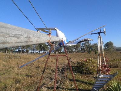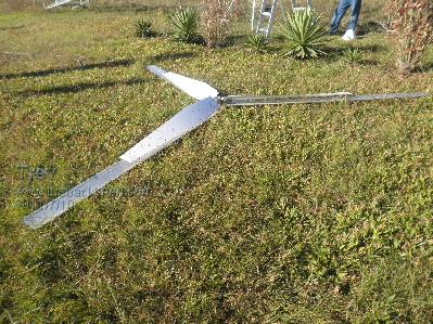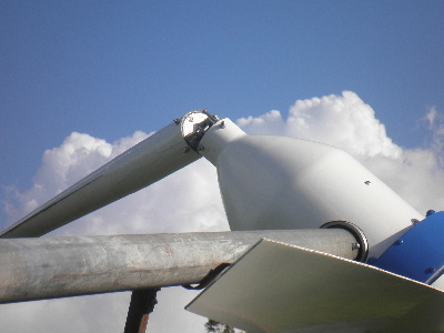 All three steel bars were bent. Two blades were bent in the middle. All 3 blades were damaged where the steel bar goes in. The steel bar was bent and the guage on the press went up to 10 ton to straighten them. I tried the blade under the press but the thin trailing edge looked like it was just going to roll over so did not put much pressure on it. I hammered the bends in the blade. Cut them back to a length of 1600mm. So would be close on 3.4m diameter now. Re assembled in the hub with 3 bolts through blades and steel bar. The two blades that had the bends still have the bends in them and now with uneven spacing between blades, balance would not be right. To balance, I just ground the end off the blades appearing to be heavier. Refitted to White Pointer AXFX. The wind was blowing, but not real strong. We pulled up the tower and some rough weather had come in quite quickly. Note the change in sky colour. The wind had picked up and while we got the tower bolted in place (scary as I did not know how the blades would handle it), Dale (son) was watching the amp gauge - 30 amps! As soon as I could get to the gauge I saw 25 amps! I went for the wind speed guage. I measured up to 20km/hr, but I am sure the wind had dropped off some by then. There was quuite a lot of wind speed fluctuation and consequently amps too. I can't check wind speed and amps at the same time, so I don't really have any solid data. The best I had seen with wind up to 20km/hr was around the 14 amp mark with the 2.9m diameter fibreglass composite blades. The next morning the blades were still on. Back to quite wind and beutiful blue sky. Another lot of cloud came up quickly and the sun was shining on the White Pointer F&P single motor 2.5m machine and looked great with the dark sky background. So I took a photo of it too. On most days since, the AXFX may be doing 1-2 amps while the F&P 2.5 is sitting still. When the wind picks up and gets the F&P 2.5 running, they both do 1-2 amps each. When the wind speed ramps up the AXFX ramps up amps quickly and outstrips the F&P 2.5 easily. Trev @ drivebynature.com |