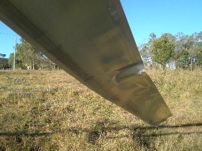 I always have the dream of making something easier. I bought some alloy aerofoil extrusion from Phil a long time ago. Thought it would be easier for blades (and cheaper too than my own fibreglass blades). They were 2200mm long, and with the hub, made a diameter of 4.6m. The idea is to catch the low wind, which is what I usually have here. The extrusions are easy enough to assemble. I fitted them up with mild steel 25mm about 300mm long into the hub I machine. I already had the hub made. It didn't take very long to fit the blades and hub together. Being so huge I could not check for balance. I was relying on the extrusions to be of equal length and distance, thus equal weight in each blade. Swapped the blades over on the White Pointer AXFX. They seemed a bit flexxy and thought they would not last. But oh well, it is a test so up we went. The blades started spinning before the tower was right up. Balance seemed ok. They seemed to spin at reasonably high speed, but did not get any real time to watch them. As the tower neared the top, the blades started hitting the welded brackets where the cables tie on. A big mistake! I should have had more bolts through the blades and steel bar. 1 bolt allowed the 2 outer skins to seperate allowing the blades tips to flex. The tower was up and straight back down. Trev @ drivebynature.com |