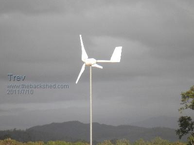 All is well here, cyclone Yasi is passed. A little more wind at times since yesterday afternoon. Some leaves and small branches were blown off. Nothing significant. We were not in direct path. AXFX (&F&P) was down for the potential blow. I just put the AXFX back up this afternoon. I have the 2.5m aerofoil blades on it and just did some measuring. Wind speed at ground level fluctuating between 8 & 15 km/hr while current fluctuating between 1-2 A at 48v battery nominal. It appears that these blades do not have enough torque for the AXFX. I did have the 2.9m composite blades on to start with. It furled too soon. I checked the weight difference between the old double F&P tail and the new one. I had to add about 150g to make them the same. I added 200g to the new one, so was then 50g heavier than the old one. It still furled too soon. I added angle to furl hinge, it is now 30 degrees of vertical. Normally set at 20 degrees. It then would hold OK but would get up speed and then turn out of the wind. The tail furl stop needs to be shorter (which I have done now with the 2.5m aerofoil blades) to allow the tail to have greater resistance to the blades wanting to turn out of the wind. With the 2.9m composite blades, it possibly would be better to have the tail longer too. I don’t know what the wind speed was, it was really up & down, but I have seen the AXFX with the 2.9m blades hit 12A, and then turn out of the wind. Here is a picture of the AXFX with the 2.5m aerofoil blades. The sky still is the results of cyclone Yasi. Trev @ drivebynature.com |