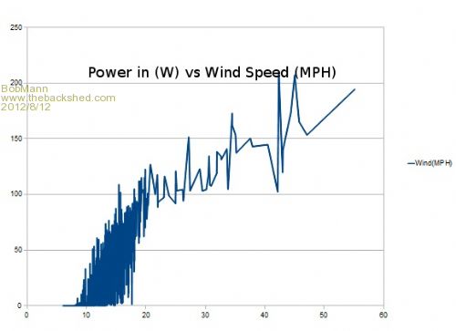 Right now the best power curve I've found seems to max out at 200v in about 18 mph winds. At that point the controller has to leave the ideal curve, to pull more current and protect itself. (the 270 watts was seen in this condition. If it was still on the ideal curve it probably would have been much more.) It seems that if the arms were 30" long instead of 18", then in that same 18 mph wind the voltage would only be 120v. The cogging would break free in 7.2 mph winds instead of 12, and the potential power would go up by 66%. This would be a turbine better matched to that alt.