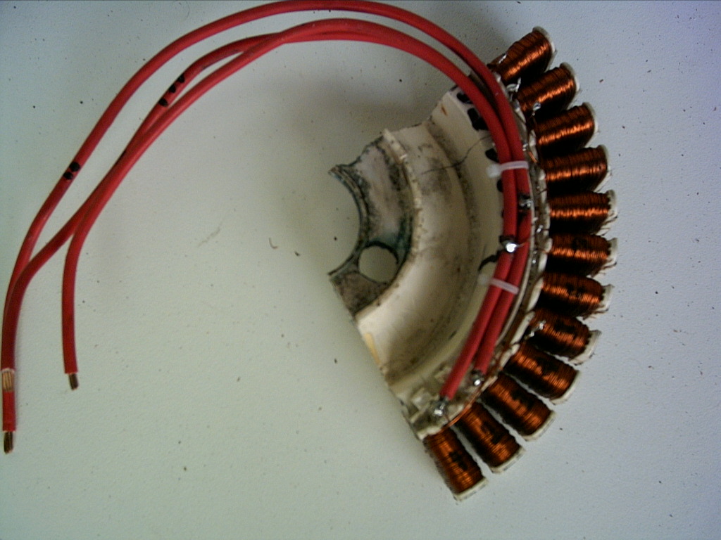 With a hacksaw I cut a wedge of 12 windings from 42 windings stator,and wired up as a 3phase star .Bench tested & rectified output was 13volts when spun hand.Heavy cogging ,will make a adaptor plate to support in the beariig holder .This may reduce the cogging. I will also try a 14 winding 7 phase cogless. Stay Tuned
