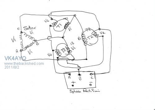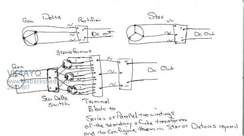 The lower one is a bit complex in that it uses a star delta switch on the generator windings then the three transformers as we discussed, the transformers have two secondary windings of equal voltage say 110 volt primary with two 15 volt windings that can be series ed or paralleled to provide two voltages and then on the same terminal strip the outputs can be connected in star or delta before going to the rectifier.