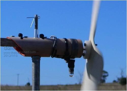 This one has a 30mm diameter all PVC turbine ( cut from some PVC down pipe ), direct drive to a DC generator ( motor from a old printer ). Output is shunt regulated ( 8v zener ) and drives a incandescent lighting plant ( 6v torch bulb ). The tail is aluminium ( from a cut up Coke can ) and tail boom in treated timber ( pot plant stick ), and ballanced ( with a 12mm bolt zip tied to the boom ). I expect a massive 0.5 watts from this rig. It actually felt pretty good to see it spin up after I mounted it to the fence post. I can just imagine the neighbours one windy night. "Whats that glow down near the creek on the place next door?" "Dunno, maybe its a ming ming light. Could be aliens?" "Get me gun!" Glenn The best time to plant a tree was twenty years ago, the second best time is right now. JAQ |