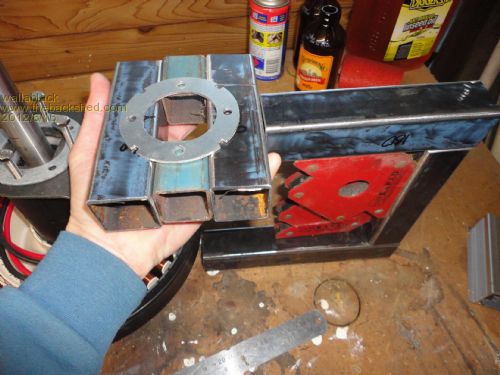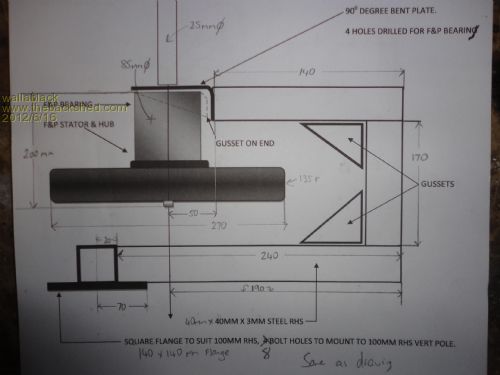 This was my evilbay purchase. Good steel to recycle.It was an old brew stand I built for brewing beer which I no longer do. I want to utilize two F&P shafts the older style srews into the new style, as long as the shaft spins the right way I shouldn't have a problem, but will probably put a collar at the join. This is a drawing I did for the mounting. The angled plate was laying around here but after looking at it all cut up on the bench I have decided it would be too weak as it would be bearing all of the forces. Will go for this idea for the bearing mount. The bottom of the frame will have a 140mm x 140mm square flange to bolt directly to the end of my 100 x 100 RHS. This is the 100 x 100 I will use for the mounting pole. They are 3m long each. They came with the house. The squashed end will be under concrete, and 2 will be welded together length ways for height. Any comments more than welcome. Foolproof systems do not take into account the ingenuity of fools. |
