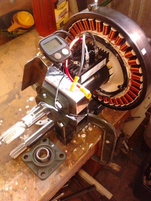 This is what my VAWT project evolved into. Thought I would share... I basically flipped it onto it's side and clamped it my bench. I brought a $10 bicycle speedo of evilbay to use as an RPM counter and mounted the sensor magnet on the mag hub. I was unsure if it would work as the diameter of the mag hub was greatly smaller than that of a bike wheel...then my brain started working and it does not matter, it is only RPM and is measured by how many passes it make...DUH. I wanted to try the same thing with one of my mills at one stage but the wireless ones don't reach that far and I would have to extend the cable on the wired ones with bell wire or similar...just didn't get my round tuit working. It is a good cheap little test bench now. I have a pulley with a 7/8"/22mm bore I plan to mount to the spline and the other end will be driven by a small electric motor. I found a fairly good nik LG motor the other day, 36 pole, 12 Mag Blocks I would like to have a play with. Foolproof systems do not take into account the ingenuity of fools. |