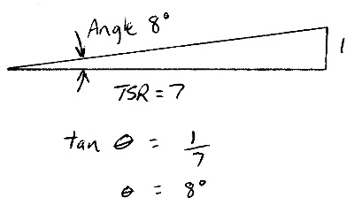Tip speed ratio is the speed at which the tip should travel compared to the wind speed. TSR of 7, the blade calculators have an angle of less than 0.5 degrees, one had it at -0.6 degrees. I think a TSR of 7 is 8 degrees. Am I missing something?