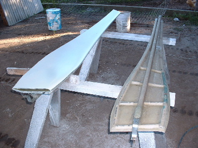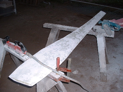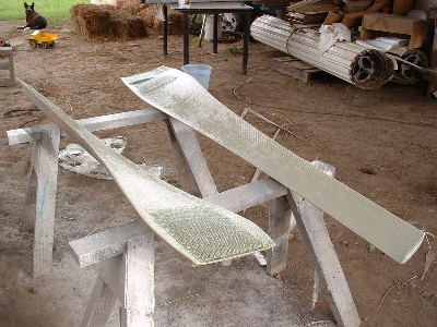 Would it be easier to start with one peice of solid soft rectangular timber the length required and with the aid of Glen's roughter cut the templates at each end and at several points in between and then remove the excess between the templates so as to end up with one solid timber blade to use as a plug for the making of one two peice mould so that the front and back , filled with foam glued together with the appropriate glass tape and polyester resin along the join. This way ever blade would be exactly the same and changes could be made to the existing moulds if required. Also could you provide some dimentions of the blade on another photo of the white blade.
