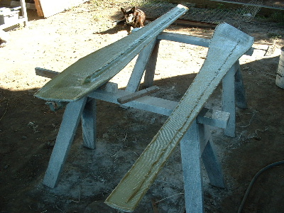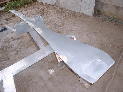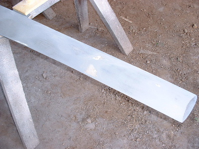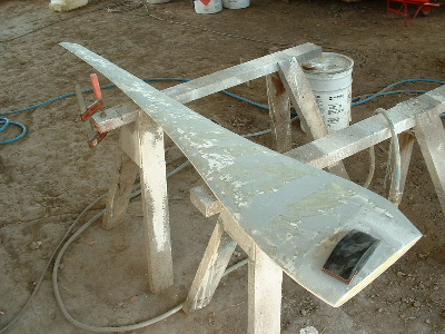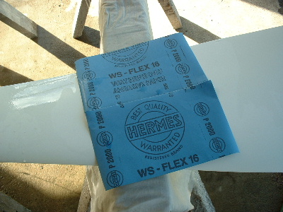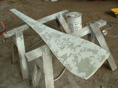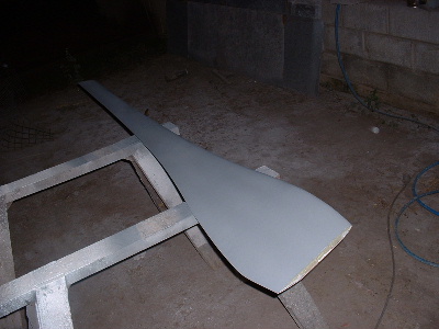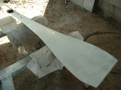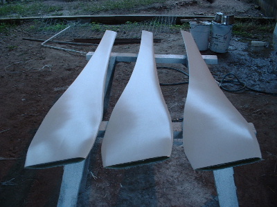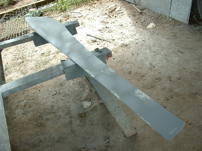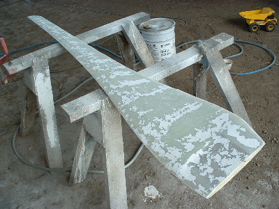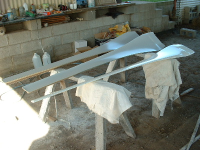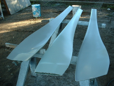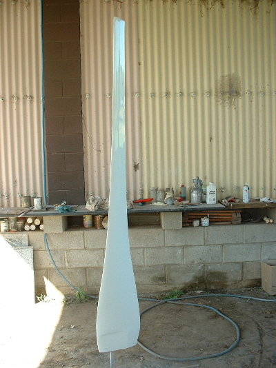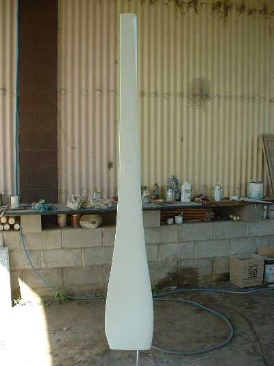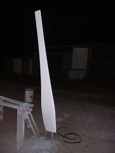Been very busy with this big blade. Plenty of sanding and filler, & filler & sanding. (Even the Torture Board). More primer/filler. More sanding. Nearing the end where it gets real hard to pick the surface variations, we use a light dusting of black paint to highlight low & high areas as it is sanded off. It is now painted with white 2 pack paint. Several days (should be 1 week) for this to harden enough so not to have any reaction with the fibreglass moulding.