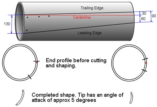 The 6 blades were cut from a 1100mm length of PVC pipe, 250mm diameter. To give some twist and keep a wide chord width at the tips, I offset the trailing edge by 30mm along the length of the blade. The wider chord means a stronger blade, hopefully, and more low speed torque.