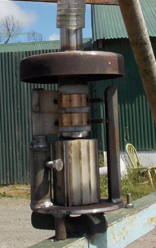 The bearing housing is a capped bit of 75mm pipe which I sunk two 6205 bearings into. The blade boss is bilocked onto the f&p shaft. The blades will later be replaced probably with geo 222 but that remains to be seen.