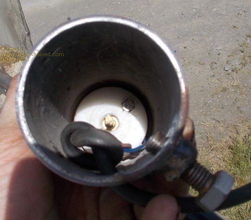 I plan to make a much larger mill with feathering blades. To try and get this right I will want to record the angle of the tail in relation to the blades. To do this I sandwiched a pot between two pieces of plastic which are mounted inside a capped piece of 65mm pipe. This 65mm pipe slides over a little piece of 50mm pipe and is fastened there with a bolt, after having made sure the fuel line slid over the pot stem. The 1/4" fuel line coming up from the tail pivot is fixed to the base so when the tail moves it will move the pot, and this movement will be recorded. I also will record the wind speed, blade rpm and blade feather angle to see if the blade feathering is working correctly. This little wind mill will not have the feathering blades but I want to have the other functions as a trial for the next one.