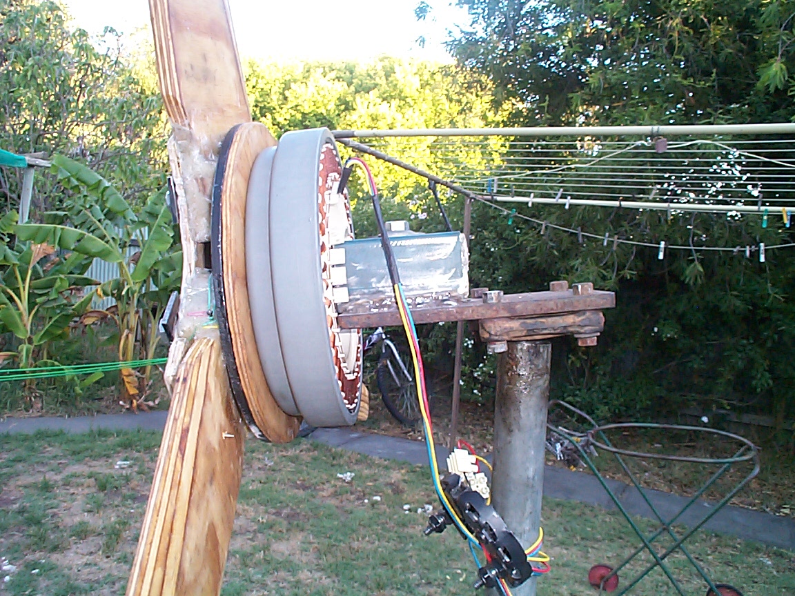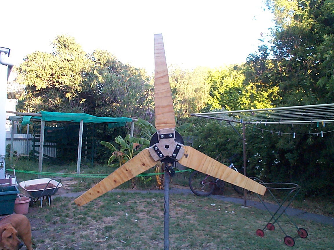 Hi fellow windmillers, first i would like to thank Glenn, Greg and Kiwi John for thier recent input, basically i have been looking at the best way to set up my F & P to gain most power. I have a property at Murray Bridge with Wind Power that can only be described as unrelenting. The wind has destroyed 2 sets of blades at 1200mm and i have now reduced my new set of blades to 900mm, i will fit up the new unit next weekend. I am deciding weather to rewire this unit to delta or leave it the way it is and put it up. Bench testing of this F & P 100s unit seems to be giving a heck of a lot of power ie i turn the unit slowly by hand and rectify it with an auto alternator rectifier and it puts out 30 + volts DC by the multi meter, i expect that given the wind power here that it would put out 500 + volts AC, i have seen my windmills spin so fast that they sound like jumbo jets !(a bit scary at times ) i need to rectify to usable DC battery bank charging and that seems to be the main problem. Any way here is a couple of unfinished photos. I have cut the shaft and placed a steel disc behind the rotor, the timber plate is a packer to overcome the stub that the plastic nut would normally be. The blades are from 18 mm ply all resined and the chords are fibreglassed, there is then a fibreglassed ply plare and 3 steel pieces of flat drilled out with 2 1/2" bolts fitted completely thru to the steel plate rhat has been drilled and taped, need to fit and balance the tail yet.