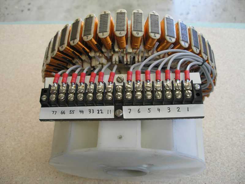 The advantage of this setup is that one can either use the coils independantly by connecting a pair of diodes at each screw terminal (28 total), or in star by linking all 7 of either the single digit or the double digit terminals.