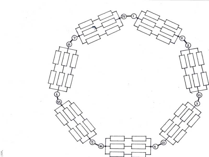 The little rectangular boxes represent the individual coils and the numbers in them are their relative position around the stator. The black dots show the start end of the coil winding. The circles show the tagstrip terminations and their corresponding numbers are within. The above circuit is how an independant 7ph 2p coil arrangement looks like. The next pic shows the diagram for a star connection:
