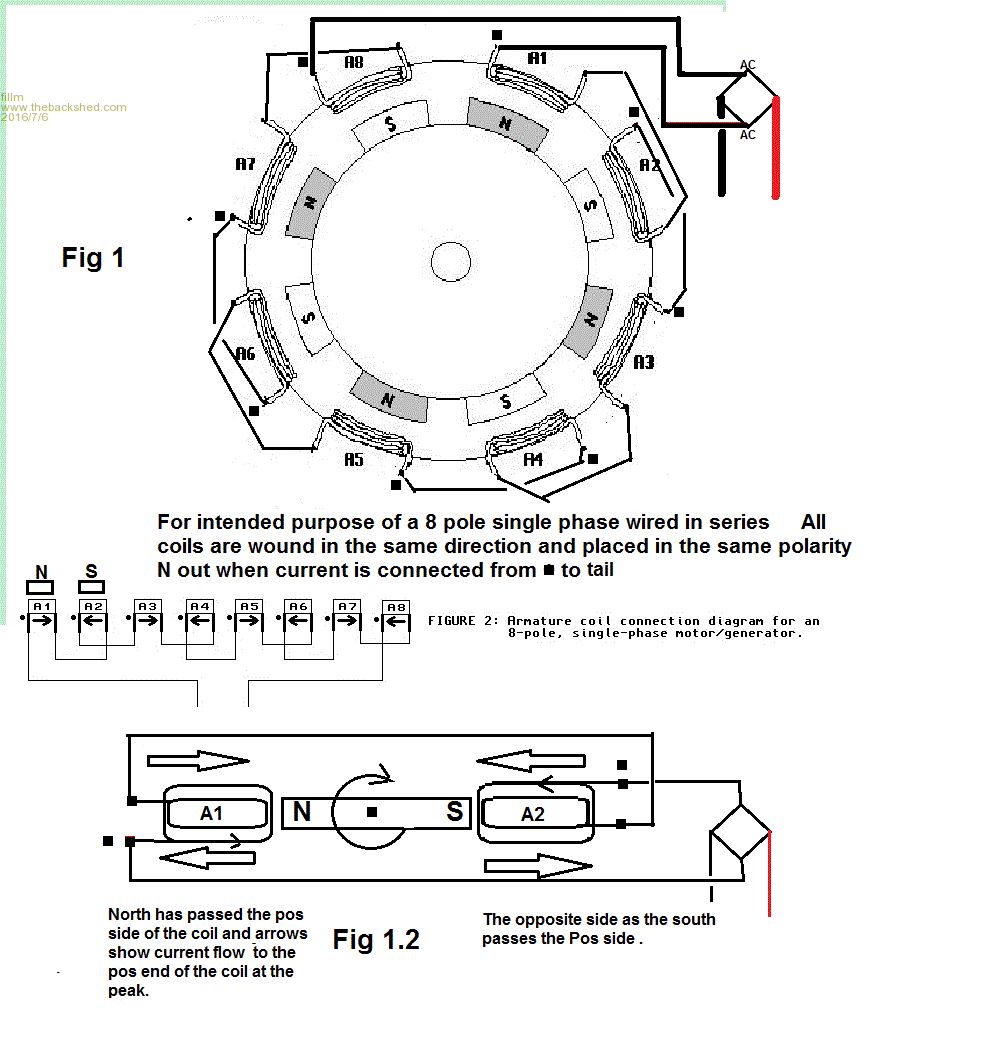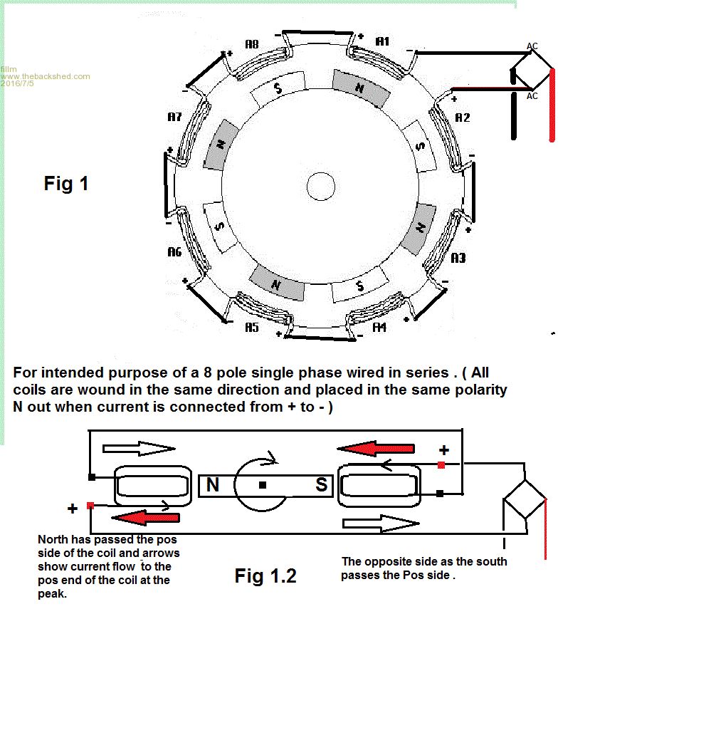 I regret I missed this topic earlier somehow, but very much enjoyed the discussion. I'll have to re-read and ponder some portions. I've never built a single phase turbine, but my 11-yo and I just put together a small alternator for his science class that - with a little trial and error - works quite well. It is pretty much a mirror of the 4-pole (Figure 9-35) that Oz posted.