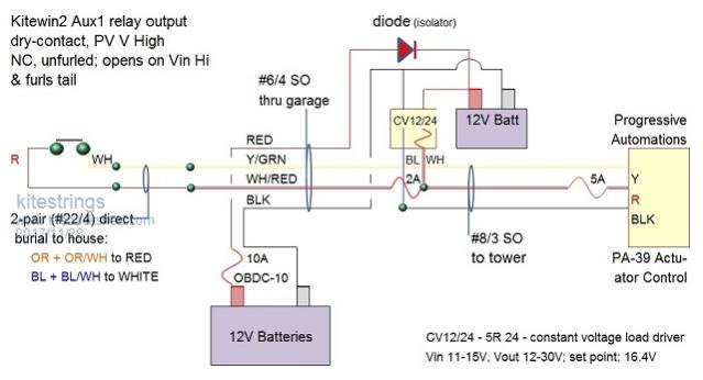 The schematic appears busy, but the concept is not. We have a small, existing 12V battery bank that runs the OH doors and a few lights in the garage. It is tied to our old, tried-and-true Trace inverter. I wanted to avoid having a battery or power supply outside at the tower, due to all the weather/temperature considerations. So, we added a single 12V battery in parallel with the Trace bank, just inside the shop closest to the tower. This battery is isolated from any load(s) by the diode, but it can be charged from the existing sources – primarily the little Rutland charger, and periodically from a trickle charger.