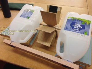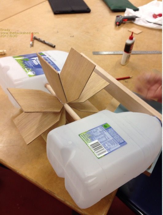 We have begun construction of a very small paddlewheel model. It's not going to be much, it's only made to see how fast the water is, and puts it into perspective of what we have to build. We have cut out 8 wooden paddle things, around 11 cm long, 8 cm wide. The paddles will be attached to a wooden axis, the paddle would floats amongst two small plastic water bottles. We will throw it into the water and see what works.