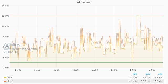 My weather station recorded wind of 50 km/h (31mp/h) and gusts of up to 66 km/h (41 mp/h) and the weather station is about 2 meters (6 feet) further down.