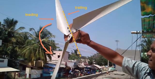 This one for example, turns anticlockwise (ignore that fact), the leading edge is towards the wind, and the trailing edge is mounted onto the hub and in line with the axis.