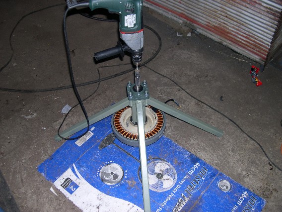 Hallo i'm pablo an live near ballarat vic and have been very interested in the f&p alternator for a vertical axis wind turbine.  I want to use the portable windturbine to drive a paddel aerator and a small pump without the use of a batterie to manage damns for aquaculture reasons and water quality reasons.  I'm donig some mech engineering at uni and had lent a optical tacho to test the motor/alternators preformance here is a photo i used a drill attched to the shaft to power the alternator and could hold it steady plus or minius 10 rpm.  I also loaded the unit and due to the current being propotional to the reacting torqueorgue found that a 100w laod will need a degree of starting torque.  The quetion is... i have now rewired the alternator to the 7 pole and have been driving a 80w thermofan for a paddel aerator and need the load to come on at about 2 volts or about 50 rpms and a universal voltage switch kit from jaycar electrics might do the trick however i'm not sure if it can hold a 15-20 amp current.  Has anyone used some kind of voltage switch to eliminate high load starting?