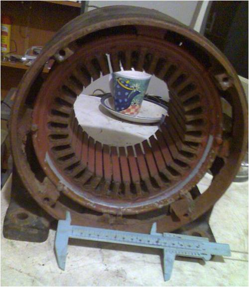 Part Two...a rethink Well, I discovered that a DIY freak such as me on a budget has to approach a new project with this mind set, "Build your toy with the building blocks available" and throw in the added touch of, "you are not crazy if you spend an afternoon gazing at one brick...imagining its usefulness and place in the scheme of things". As much as I like the idea of drawing a planned blueprint of a generator and then heading off to a mill to create your work of art is, it is beyond my budget. I don't have a mill and I can not afford to pay someone to do the work. This leans me towards the following thinking..."I want to create a generator, how I get to finish it will depend on what bits and pieces I have available". What I get to use it for depends on what I have created. Well, enough of the quotes and philosophising. I have removed the stator from the casing as I need to clean and reseal the laminations. I suspected the lams were not in great condition and affected to varying degrees by rust and general deterioration. I am going for a flexible high temp primer of some description that is not relatively conductive to reseal them. Here is a pic of the stator removed from the case...