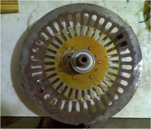 A painful job time wise and patience is needed not to distort the laminations when separating them from each other. The next picture shows that I think I have resolved my main issue...finding a rotor to fit inside the stator. I have several old ceiling fans in the back shed and I toyed with the idea of fitting a square peg in a round hole...