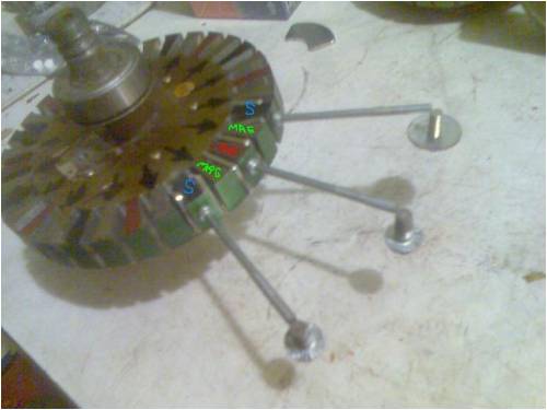 The black arrows show where I will place the larger magnets. I threw some heavier bolts on the ends of these long ones and was very happy with the depth and strength of magnetism. Ideal for reaching into the stator slots where I will have the copper wire. The tiny neo magnets although butchered and very unhappy, are amazingly strong and sniff out the laminations on the rotor like flies on sh*t ...can't wait to get some bigger ones and smash a few against my fingers.