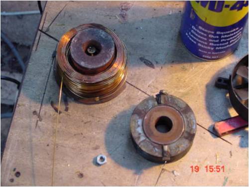 Now we find some likely source of wire to fit our requirements. In this case, the center rotor core from an alternator seems to be .8mm thick, so thats what we'll use. Here are two spools from alternators. One half used already (on this project).