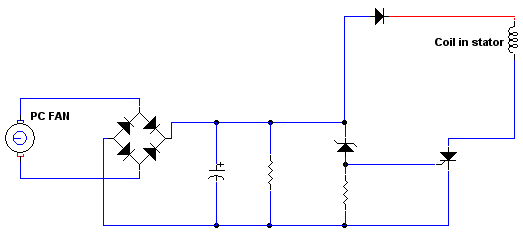 Gizmo said  I thought about mounting a modified cooling fan from a PC power supply on the windmill, and use this to charge a capacitor ( say 100,000uF ). When the cap reaches 30 odd volts, dump this via a SCR into one of the phases.