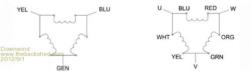 One thing to be aware of. It is normal practice to always connect three phase alternator windings in star connection. The reason for this is that if the voltages generated are not three perfect sine waves, connecting the three windings in closed delta will result in circulating currents around the three windings. That could well waste power and heat up the windings all for no useful purpose. You can test this for yourself by breaking into the closed delta connection at one point, and measuring the circulating current (if any) with a low impedance amp meter. It may not matter, or it could be a significant problem, depending on what you have. Cheers, Tony. |