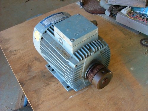 I've been keeping an eye out for a induction motor suitable for converting to a windmill alternator. If you have access to a lathe, an induction motor conversion is a worth while project, so long as you can find a suitable induction motor. I found a good-un. The local dump has a recycling center, and I picked this beauty up for $10. I took my multimeter with me to test the phases before spendig the money, all measured good, no shorts to earth, and the bearings felt good.