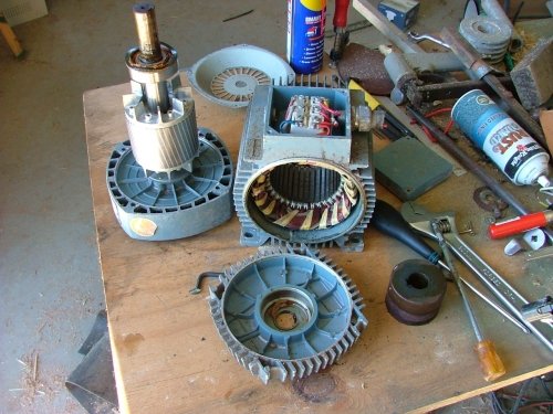 Its a 900 RPM 0.75kw 3 phase motor. The shaft diameter is 25mm, rotor is 90mm diameter and 65mm long. When looking for an induction motor for conversion, the lower the rated RPM the better, lower RPM means more poles, and more poles is good!. This one is 900rpm, and has 6 poles per phase. Each coil is easy to access, so I can seperate the coils and connect in series/parallel or parallel if required.