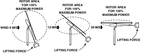 It is wind force that forces the blades to cone. The machine cant over speed because blade is no longer producing more lift than the desired amount to continue generating the alternators peak output. The blade angle changes as it cones. It works on two off set angles at the root connection point.