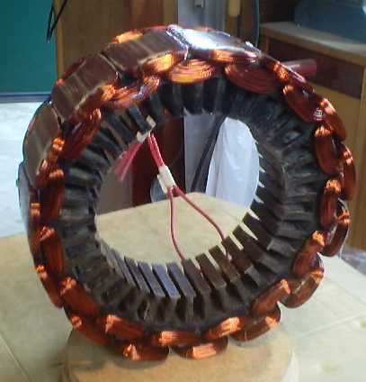 I am bemused. My AxFx alternator has similar magnet volume and probably similar power rating, yet the fully made stator including encapsulant resin and glass fibre weighs in at 350g,[12.5oz]. You calculated the wire alone to be 3.5#, or 56oz, or 1568g in your configuration. This is 4.5 times more copper. I have some internal pics here Gordon's AxFx alternator pics