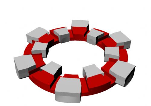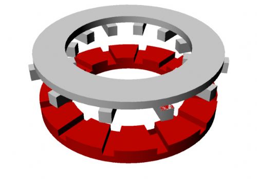 The first model is of the stator and magnet plates. This shows a wave wound thin stator. If my numbers are correct, I should get ~50 turns #19 AWG wire I should have twice as many 'cuts' of the flux as a 12 magnet 9 coil machine and a greater flux density. (.0359" diameter wire, slot is .345" X .25" deep and 60% fill was used.)