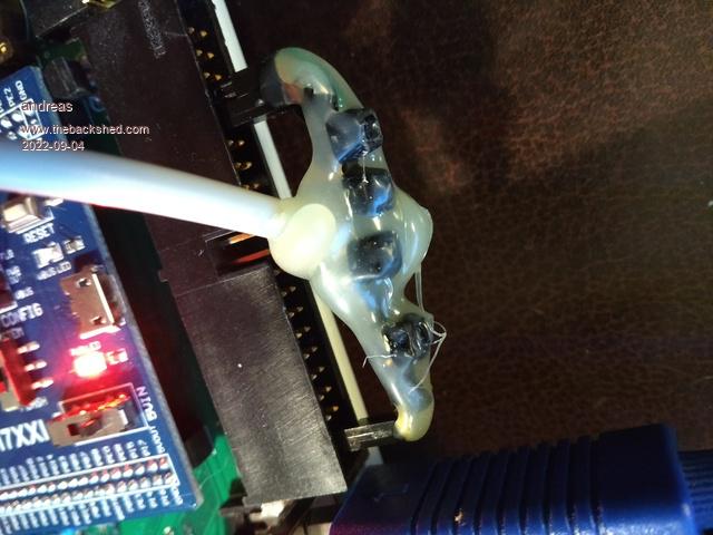then I soldered/crimped 4 single-pin connectors on a cable which was once used to make a mouse cable longer. I cut off the male part and took the female connector an some 15 cm of cable.