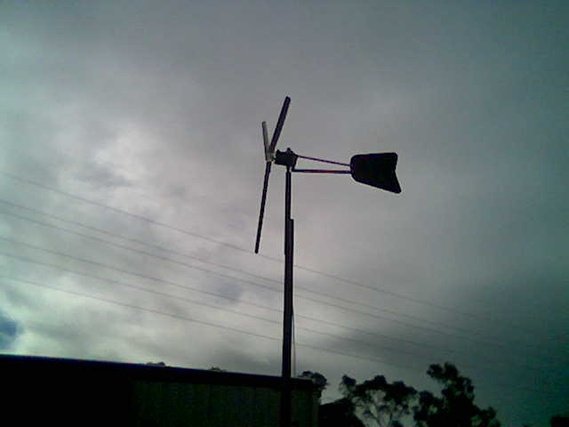 Well the first attempt with the plastic blades proved worthless as the blade profile was all wrong and it wouldn't get any decent speed so I made up a 7 ft 2 blade prop using Alton's blade calculator and made a new tower out of 2 sliding door rails tek-screwed together and the tower is just under 7 metres. Below is a photo of the new setup and today I'm busy chopping down a few trees to give the genny clean air but bloody Murphy struck again no wind since I put it up yesterday.When I put a battery to the terminals to check out the direction I noticed it wasn't spinning that fast when 12 volts was supplied to it so it should be perfect for the nife batteries and I've beefed up the dump load to cope with any extra power once the batteries are fully charged.