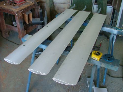 Next day, I cut 3 lengths of the PVC blade, each one 1150mm long. These were slid over the steel tubes and pop rivited in place with 5 rivits each, 3 on front and 2 at back.