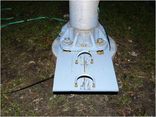 Here are some photos of the base plate I made. I made this plate because I only use three guys and it will only allow the mast to till North South. (in my case) It did take some doing. You have to be sure the plate is solid. It has to be bolted and or welded in such a way so it will not get lose from the foundation or the tower will fall. (East West) With no side support wires the gine pole has to be very strong and ridge or it will bend and that would not be good.