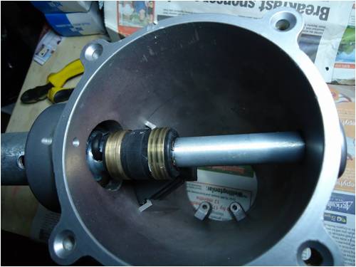 Here's the slipring assembly. Note one of them has 3 narrow shiny rings on it, indicating that the brush is not making full contact with it: