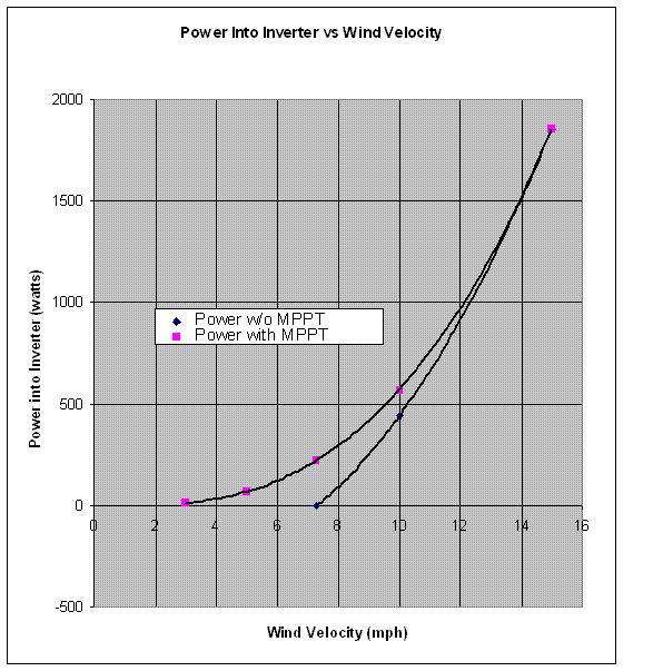 Shown are two plots; one with mppt, the other without. Notice the increase in power delivered to the inverter with mppt. This is especially significant for South Central PA with average wind velocities less than 8 mph.