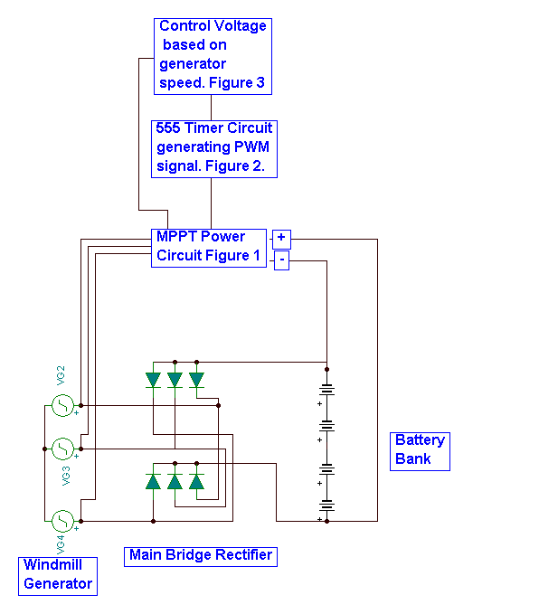 1. Power shown in Figure 1.This circuit takes power from the generator and transfers it to the battery bank. It receives a pulse width modulated (PWM) signal from a 555 timer circuit that is used to control the voltage at the bridge rectifier “DC+” terminal. Controlling this voltage sets the power transferred to the battery and regulates the load on the generator to assure MPPT.
