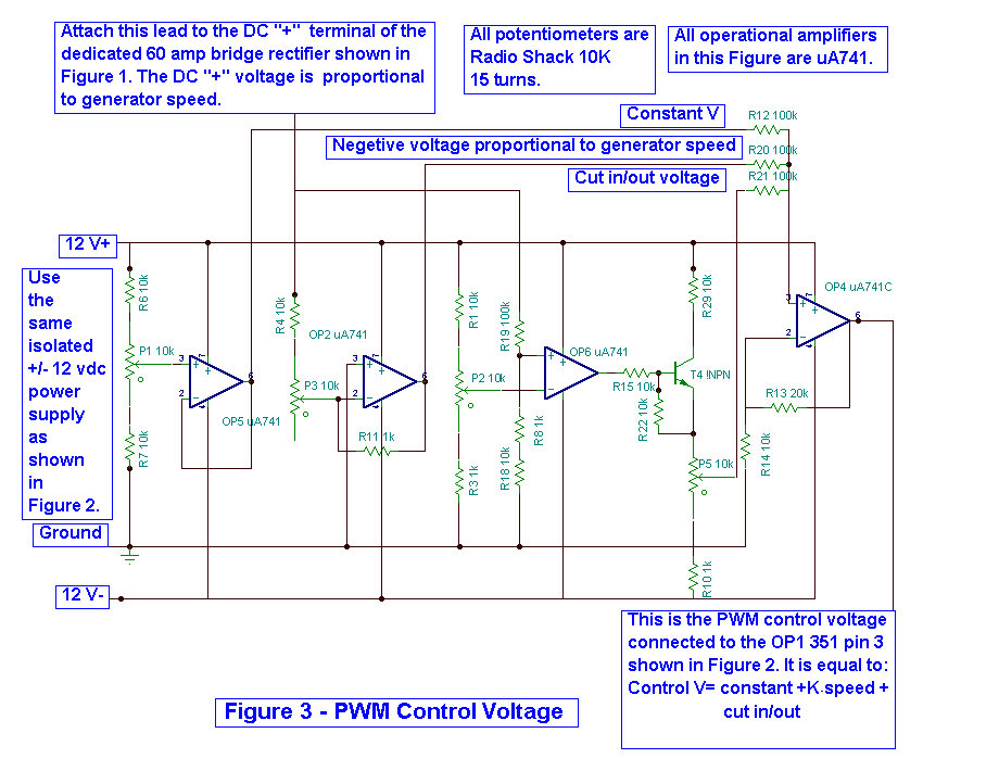 7. Adjust potentiometer P3 to achieve a preliminary voltage of about -2.5v at R20. This voltage varies in proportion to generator speed. The PWM control voltage (OP4, pin 6, Figure 3) = Constant V (R12)-Kgen speed (R20) should = 6.5-2.5= 4.00 volts