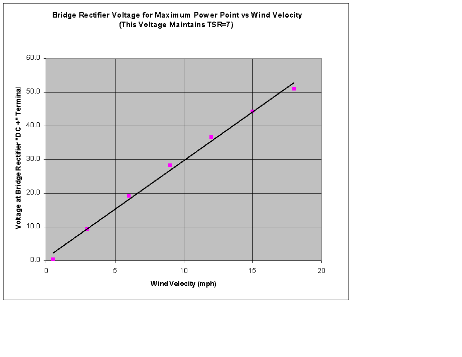 2. The circuit should load the windmill generator so the blades operate near their design tip speed ratio (TSR) for wind velocities between 3 miles per hour (mph) up to the design point wind velocity where the blade TSR naturally occurs. This design point velocity for my 20 foot diameter windmill and generator (shown here: http://www.fieldlines.com/story/2009/3/2/171331/4786) is about 18 mph.