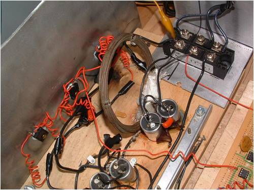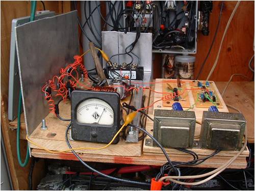 The +/- 12 volt power supply is shown in the front right; Mosfets and their heat sink plate (8"x12") are shown on the extreme left; bridge rectifier, back left, circuit boards, back right. The DC ammeter is reading about 14 amps.
