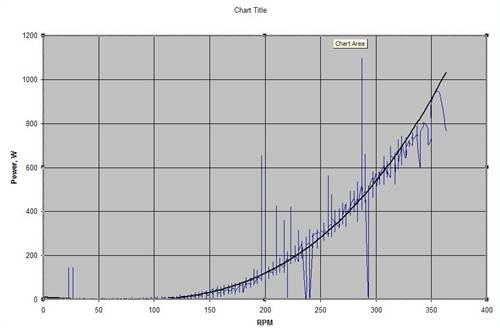 This is just the sorted, raw logged data at 10 sec intervals, RPM V output power, compared with a cubic power curve. I have not removed any of the data, so there are some glitches that have come through as well. too bad.
